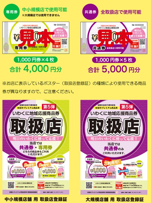 「いわくに地域応援商品券」は「中小規模店のみで使用できる専用券」と「大規模店を含む全登録店で使用できる共通券」の2種類をセットで販売されてますが取り扱っていないお店もありますので、ご注意くださいませ。