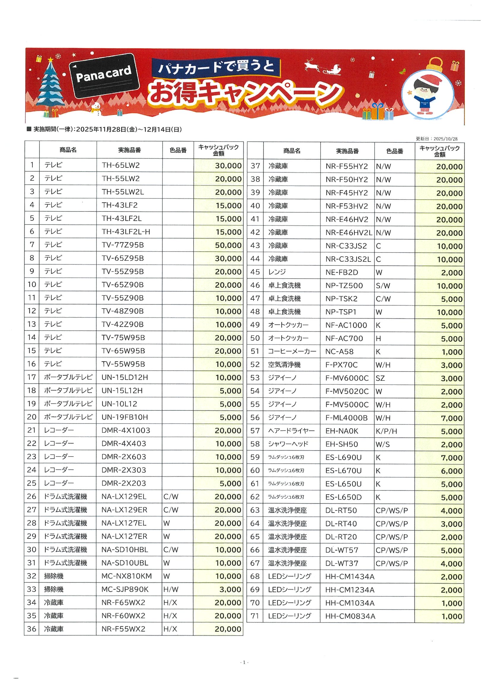 ◆対象商品、キャッシュバック金額