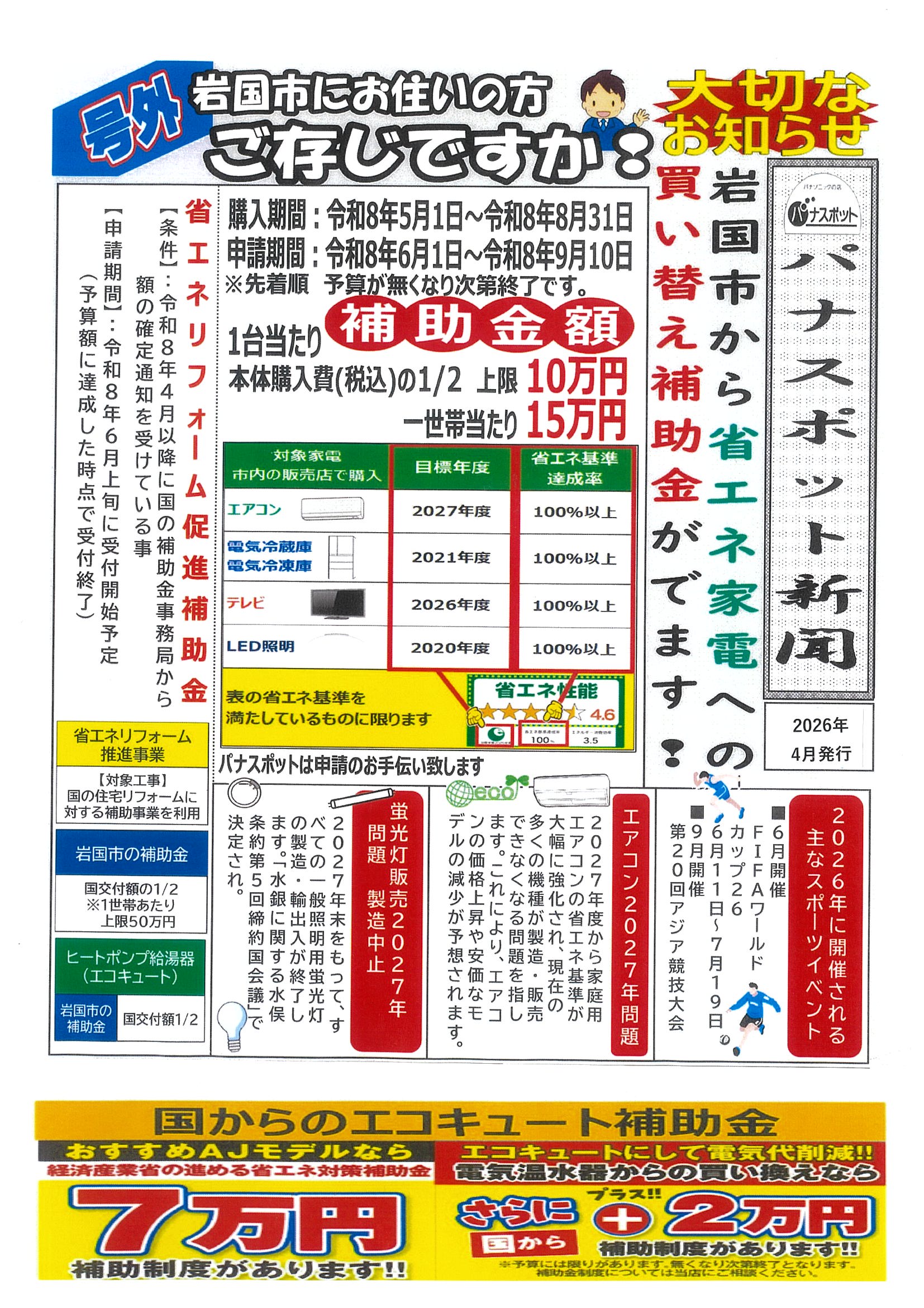 省エネ家電について、また、岩国市から家電の買替補助金制度の他にも『省エネリフォーム促進補助金』などといった制度もございますので、詳しくはパナスポットグループのお店にお問合せくださいませ(`・ω・´)b
