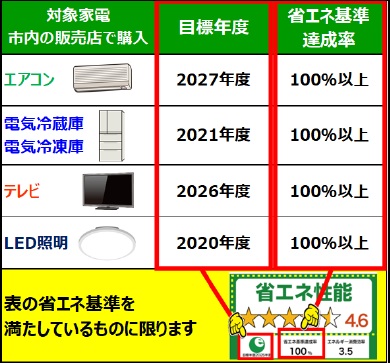 ◆対象商品:省エネ基準達成率100%以上のエアコン、電気冷蔵庫、電気冷凍庫、テレビ、LED照明